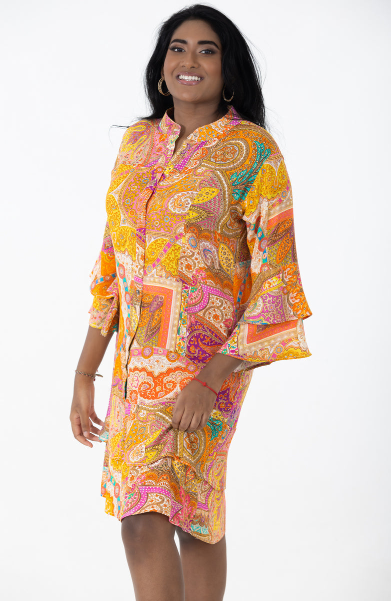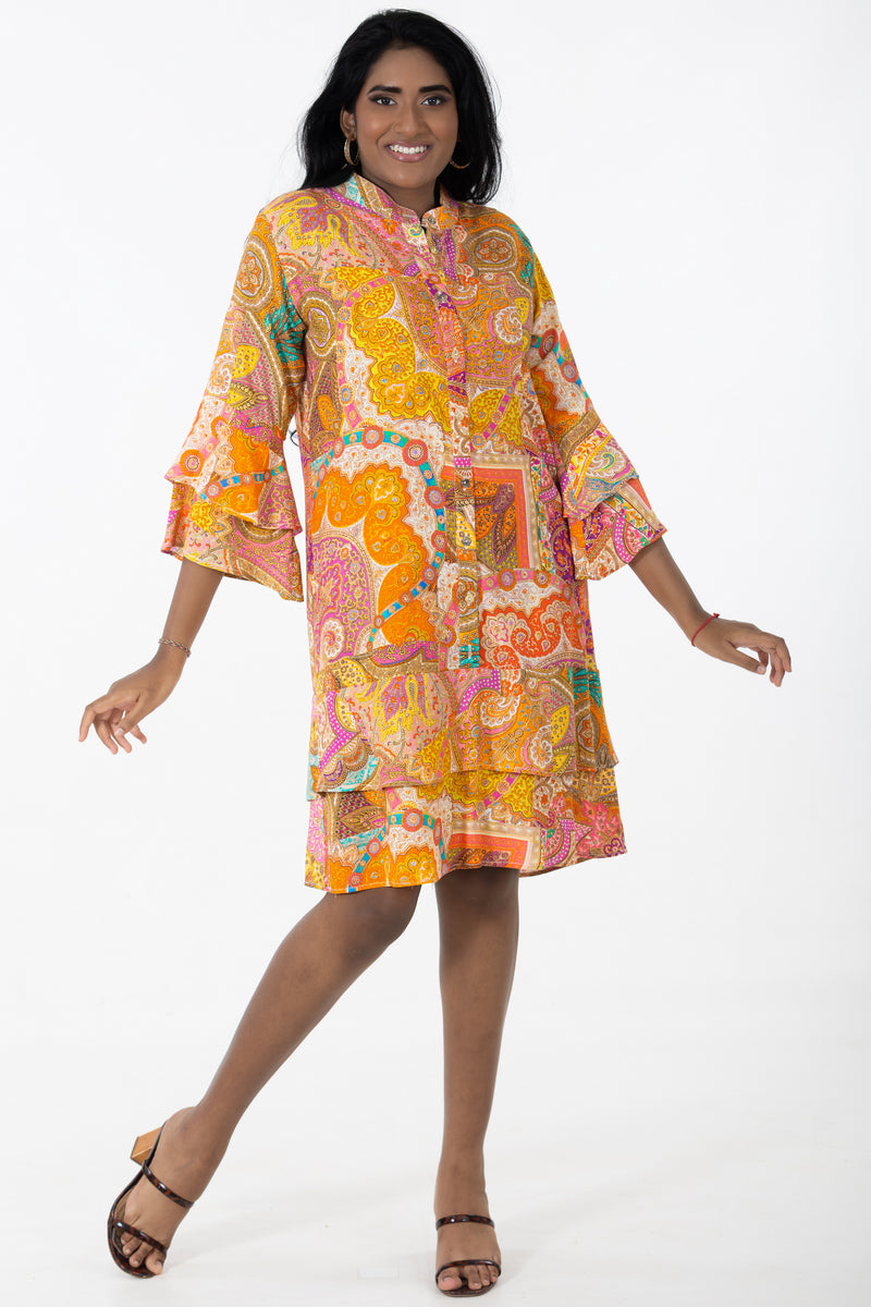 Crafted from breathable, high-quality imported Spanish viscose, this dress is ideal for warm weather, keeping you cool while looking chic. The midi length offers a versatile silhouette, flattering every body shape, while the flared sleeves add a touch of feminine elegance and modern sophistication.